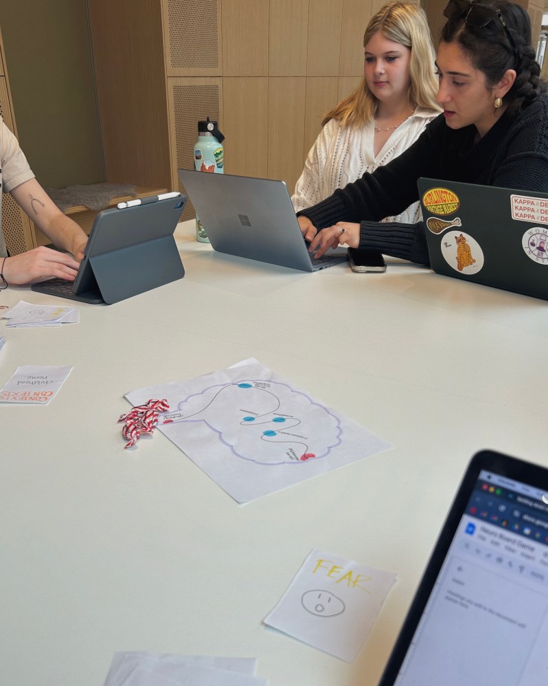 This is us working on an early draft before class, with pieces of candy as game tokens.